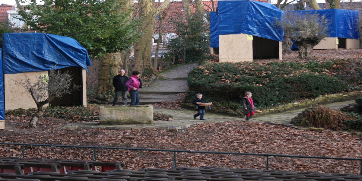 Vandaag alles voor de pauze. Wel zonder muziek en zonder microfoons. Wel jammer want nu kan de grote groep het niet verstaan. Er zijn huisjes die al wat aan inrichting hebben gedaan. Zo staan er al bankjes en kruikjes.