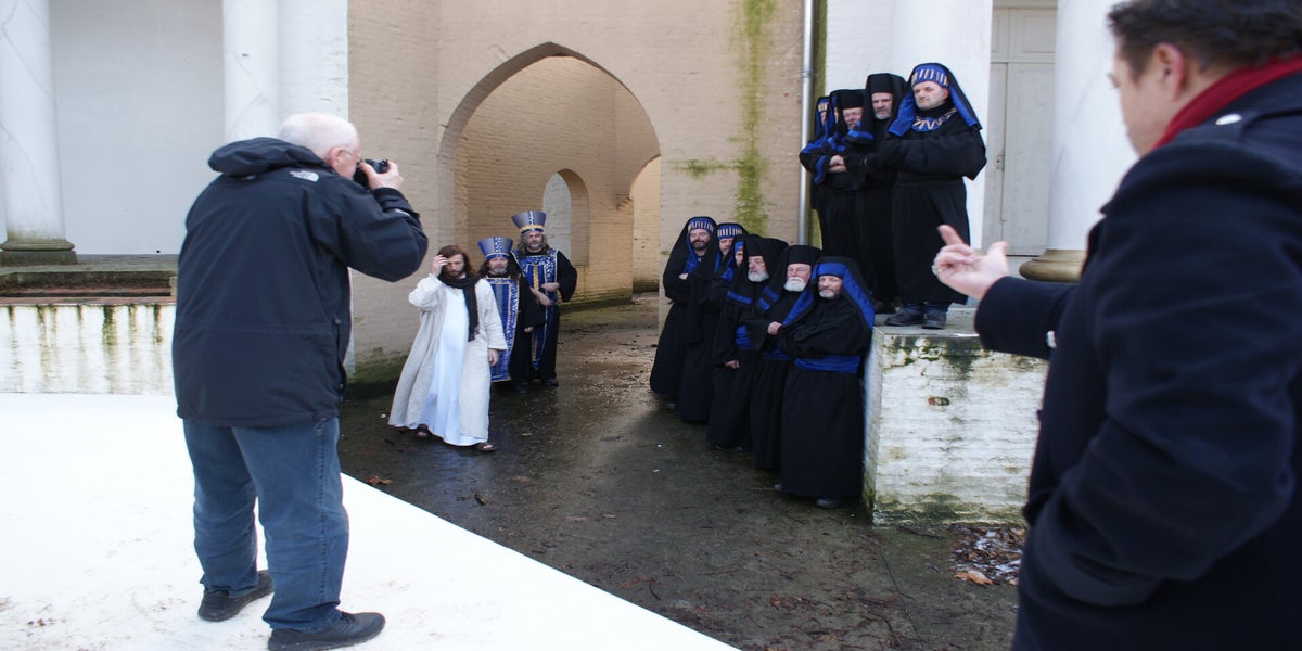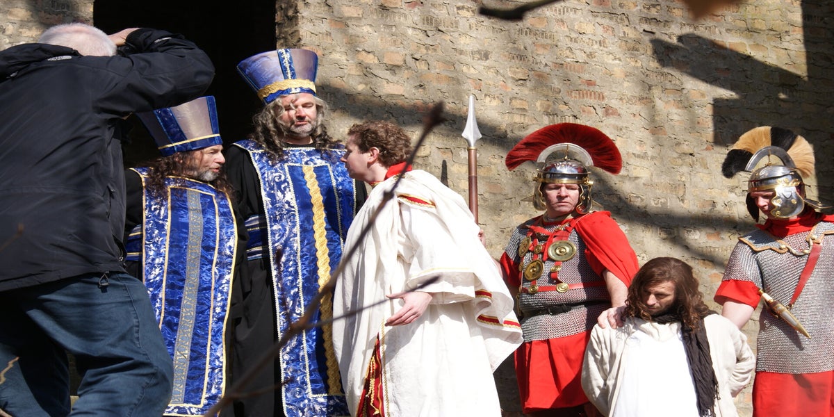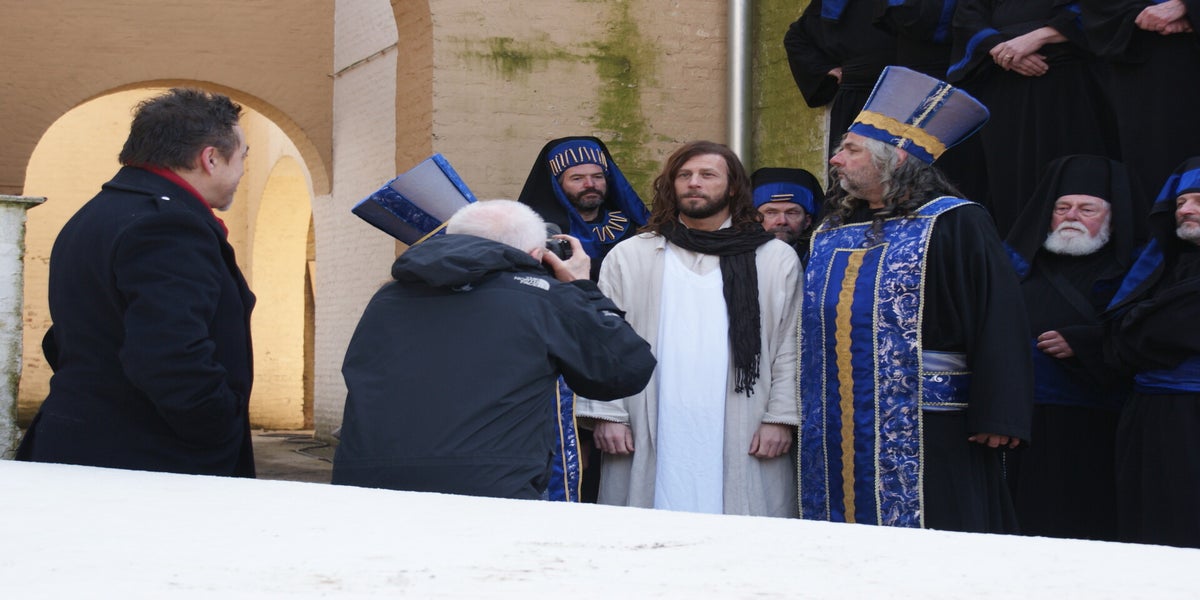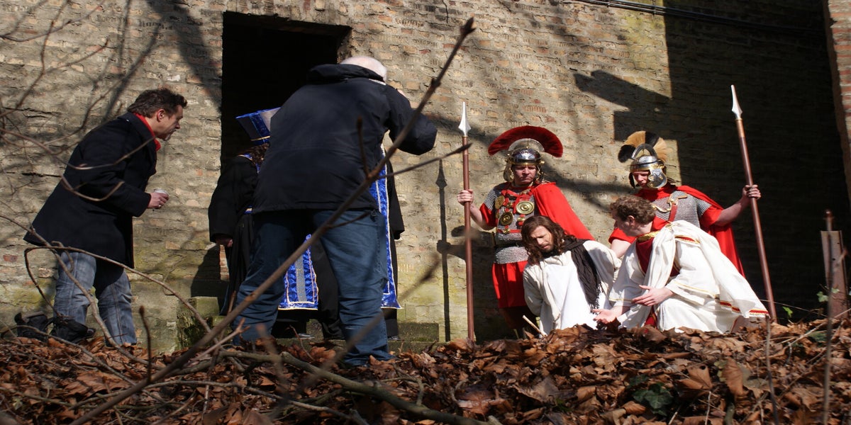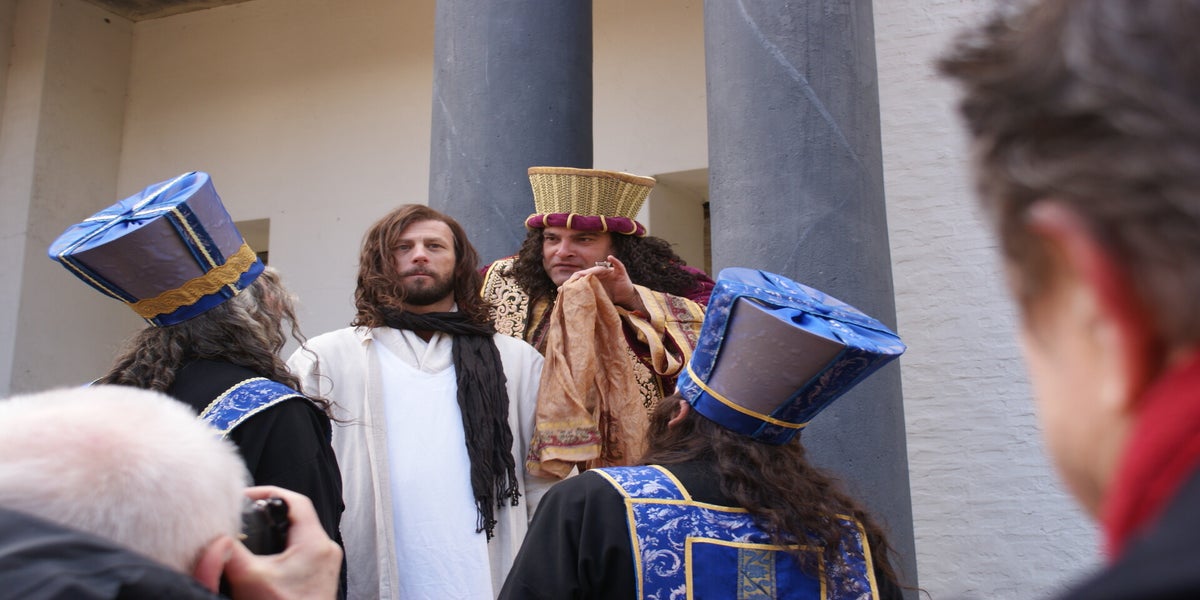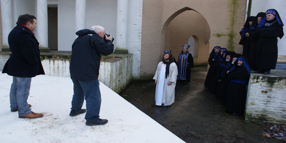 De televisieploeg staat te wachten op Cees en Nard. Daarna wordt de scène met Herodes opgenomen. Deze spelers staan geheel in kostuum, dit vond de KRO wel een leuk idee. Dat niet iedereen hiervan op de hoogte is blijkt als Pilatus “akte de precance” maakt in spijkerbroek.
