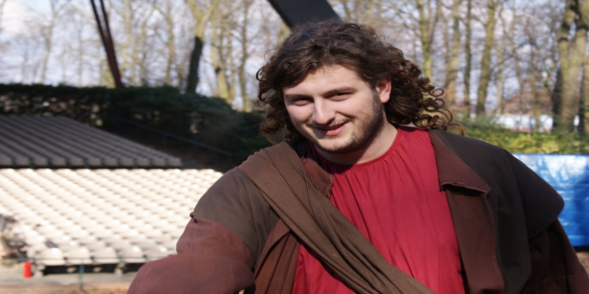 Als we achter het toneel komen dan hoor ik een hoop herrie uit de tent komen. Erik, onze technische man, is flink aan het zagen. Antwoord voor deze herrie ligt in het feit dat hij druk is een prikbord aan het maken. Hierop zullen alle spelers informatie kunnen vinden. Dan zie ik ineens Waldo binnen komen. Ik loop naar Joran, het jongentje dat tijdens de intocht op de ezel zit, en vraag of hij Waldo al gezien heeft. Samen lopen we naar de ezel en zet ik Joran erop.
