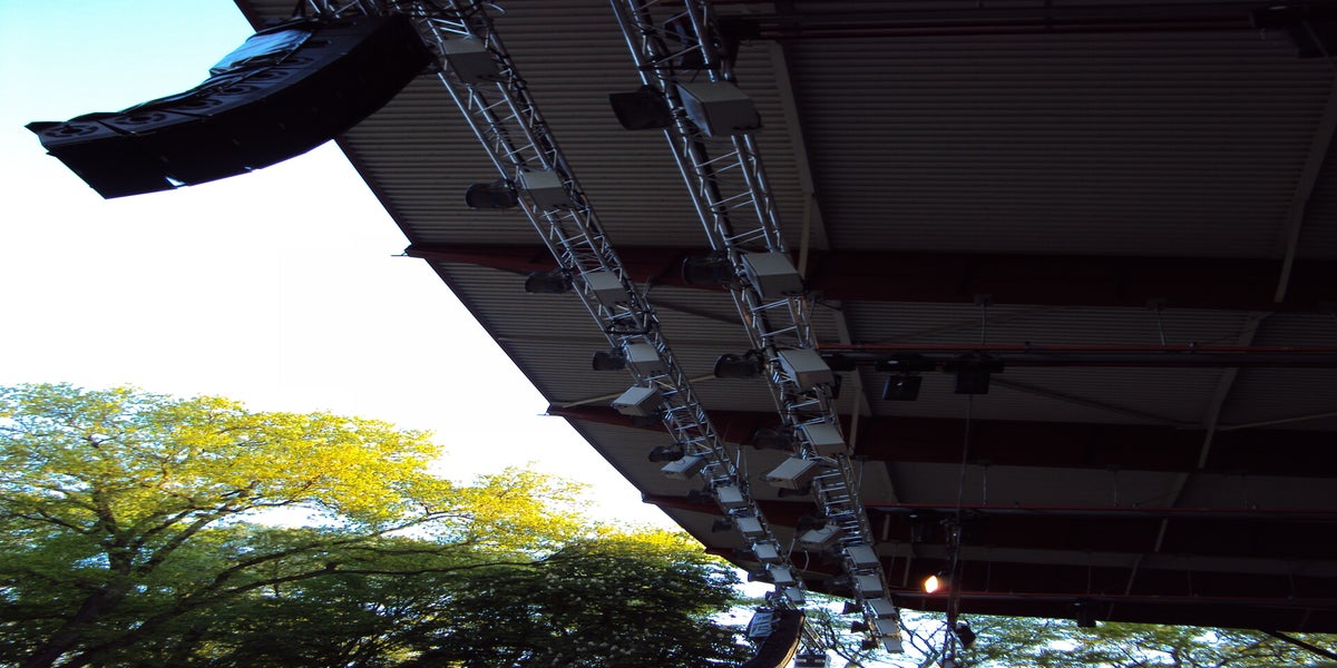Deze verlichting hang voor de dagvoorstelling, dit om het ook al hebben we een bewolkte dag bij te lichten. Vanaf het podium ziet het er erg indrukwekkend uit. Ben benieuwd hoe het eruitziet als ze aangaan.