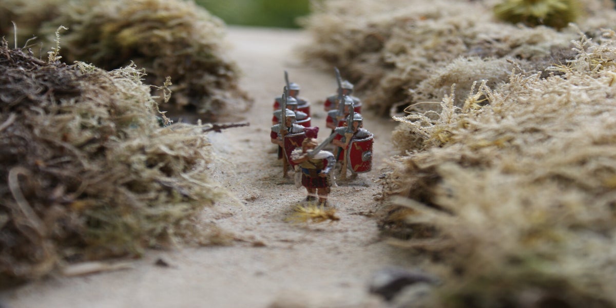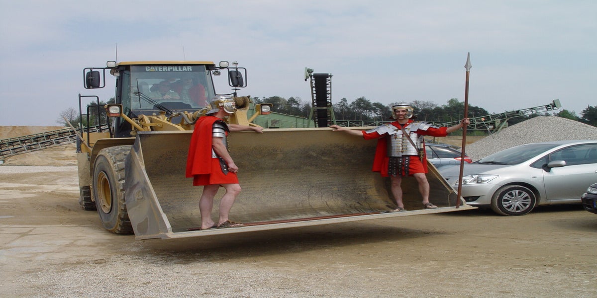 De Romeinen hebben vandaag een aparte manier van transport. Voor in de bak van de bulldozer. Alleen die arme Owen Houba. Hij moet de schilden dragen en loopt. Gelukkig niet het hele stuk maar alleen het laatste deel.