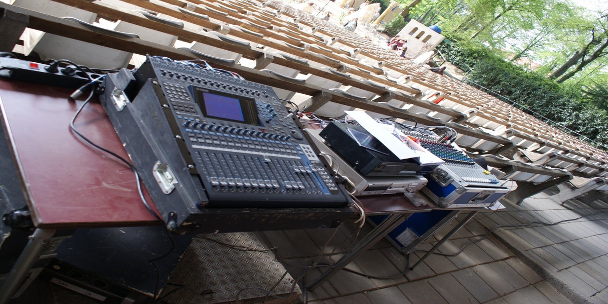 Vanaf de tribune klinkt muziek. We spelen vandaag met geluid. De firma Houben heeft een enorme digitale mengtafel neergezet die al helemaal voor de passiespelen geprogrammeerd is. Echt High Tec. Incl. 2 laptops die de hele zaak controleren. Op 1 pc staan de regeliong van de speakers die in het theater hangen. De andere houdt de draadloze microfoons in de gaten. Iedere microfoon is op het scherm te zien.