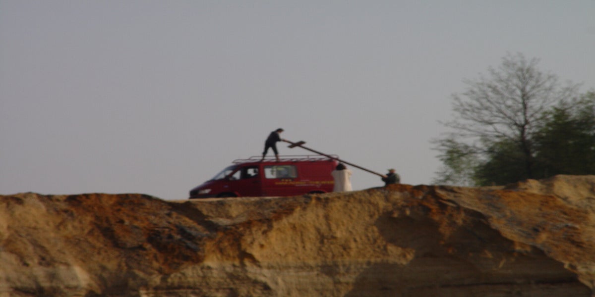 Daar komt regisseur Cees Rullens aanrijden met zijn rode bus. Boven op het dak ligt het kruis. Het heeft vandaag veel weg van Jezus Christ Superstar. In de zand en het kruis dat boven op het dak van de bus ligt. Af en toe hoor ik collega's zelf nummers uit deze musical zingen.